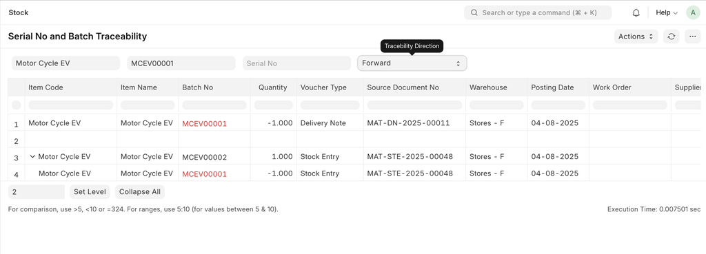 Serial No and Batch Traceability Report